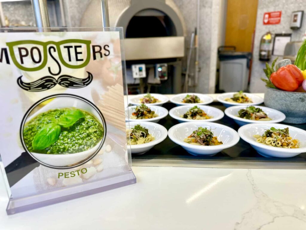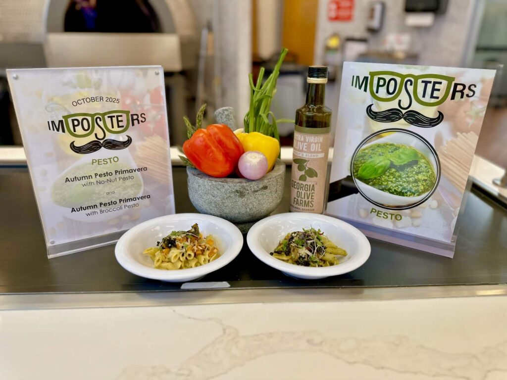 The concept is simple (and delicious): we offer two versions of a dish — one made with a traditional ingredient and one with a clever stand-in. This month, our star ingredient was no-nut pesto. Traditionally, prepared with basil as a base, chefs also created Imposter: Broccoli Pesto.